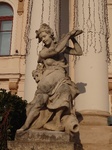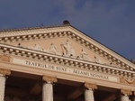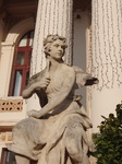 A portikusz két szélső oszloppárja elé egy-egy nagyméretű, a budapesti Mayer-féle műhely által készített allegorikus nőalak került, magas posztamensre, ezek a drámát és a vígjátékot szimbolizálják.