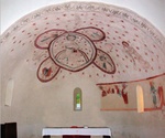 14. századi falképek töredékei maradtak fenn a szentély falán, s a bejárat mellett. A szentély kupoláján csillagos háttér előtt, mandorlában a megdicsőült, trónon ülő Krisztus látható, négy oldalán az evangélisták alakjával. Tőlük jobbra Keresztelő Szent János térdepel. Az ablakok magasságában talán a 12 apostol képe szerepelhetett, de közülük már csak 4 alak látható.