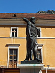 Herkulesfürdő legrégebbi részén, a hangulatos Herkules téren áll Hercules isten vasból öntött szobra. Az 1847-ben készült alkotáshoz ágyúk beolvasztott anyagát használták fel. Károly román herceg ajándékozta a fürdőhelynek hálából azért, mert sok katona e gyógyhelyen nyerte vissza egészségét.. Az egészalakos alkotást a római Hercules-szobrok mintájára, azokat másolva készítették el. Az istenség bal kezében attribútuma, a kőrisfa törzséből készült hatalmas dorong látható. Jellegzetes még ruhája: a kithairóni oroszlán bőre. A szobor kőtalapzata kútként szolgál: négy oldalán egy-egy vas oroszlánfej van elhelyezve, melyek szájából tör elő a vízsugár. A vizet a szobor alját körülvevő medence gyűjti.