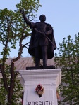 A Kossuth Lajost (1802-1894), Magyarország kormányzó elnökét, az 1848-49-es forradalom és szabadságharc, egyben a magyar történelem emblematikus személyiségét ábrázoló alkotást 1901-ben avatták fel, ünnepélyes keretek között. A Tóth András szobrászművész által bronzból öntött, egész alakos, életnagyságú szobor egy lépcsőkre helyezett, csonkagúla alakú, erős párkányzattal díszített, mészkő talapzaton áll. A realisztikus szobor patetikus pózban ábrázolja a kormányzó elnököt. A zsinóros magyar dolmányos, hosszú köpenyes, hosszú szárú csizmás nemes vezér baljában díszes szablyáját tartja, míg jobbját magasra emeli. Kossuth szenvedélyes és nagy hatású szónok volt, a megörökített kép is nyilván erre utal.