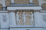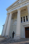 Az épület \"fő\" homlokzata mindenképp az északnyugaton nyíló bejárati rész, amelyet oszlopos portikusz, fölötte timpanon és egy gúlasisakos torony hangsúlyoz.