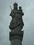 A három, egyre szűkebb hasábból álló talapzatból emelkedik ki a hengeres, dór oszlop. Ennek tetején találjuk a kőből faragott, életnagyságnál kisebb méretű, álló, köpenyes Mária alakot. A részletekig kidolgozott, redőzött ruhájú, koronás Mária jobbjában aranyozott jogart tart, míg baljában a kisded Jézus ül.