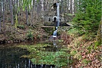 A park egyik, az 1820-as évekre eső átépítése során készült el ma is látható, látványos, egyben romantikus hangulatú vízrendszere, Josef Bergmann tervei szerint. A vízesést a park északkeleti, magasabban fekvő részén, egy patak felduzzasztásával kialakított, mesterséges tó csatornán ide juttatott víze táplálja. A csatorna legutolsó, közvetlenül a vízesés előtti szakaszára 1823-ban látványos, a római akvaduktokat idéző, tört kő csatornahidat építettek, amelyet boltíves nyílásának 3,7 m fesztávjával és 1,7 m magasságával a kert tájképi elemének is szántak. Ezután 90 fokos fordulatot véve kanyarodik rá a csatorna a vízesésre. A több, mint 8 m magasból lezuhogó vizet egy kisebb, majd egy nagyobb medence (tó) fogta fel.