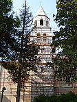 A templomon felújításokat végeznek a torony déli oldala be van állványozva.