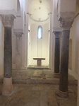 A keskeny, háromhajós teret három oszloppár tagolja. A mellékhajók félköríves lezárásúak, míg a középhajó szentélye négyzetes alaprajzú. A 9-10. századra teszik az építését, a bejáratnál a felirat Maius priornak és unokatestvérének tulajdonítja az építését 1000 körül.