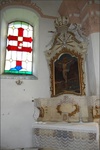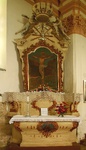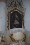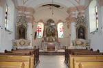 A porosz boltozatokkal fedett templom belső falfelületeit gazdag rokokó stukkó díszítmények ékesítik. A szentélyben egy főoltár, míg a diadalív két oldalán 1-1 mellékoltár látható, ezek mindegyike későbarokk és a templom felépültekor kerültek ide. Ugyancsak eredeti, későbarokk-rokokó stílusú a templom díszes kegyúri padja és márvány keresztelő medencéje.