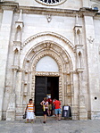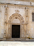 A templom homlokzata még tisztán a gótikus stílus szellemében készült, ám a rozetta és a közrefogó oszlopok már reneszánsz stílusjegyeket mutatnak. A templom oroszlán-kapuját (ez az oldalsó főkapu) rómán és gótikus díszítőelemek jellemzik. A bejárat két oldalán oroszlánok tartotta oszlopokon Ádámot és Évát láthatjuk. A kapu csúcsíves tabernákulumában Szent Péter és Pál szobrai álltak, de ezek a délszláv háborúban megsemmisültek, így helyükön már csak felirat látható. A nyugati gótikus főkapu mellett egykor a tizenkét apostol képmása volt, de a háborúban ezek is megsemmisültek, manapság a helyük üres.