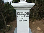 Felirata jelenleg: ,,SZENTJAKABI HEGYKÖZSÉGNEK 190... JÚNIUS HÓBAN''. Hát nem tudom, hogy ez mennyire egyezik az eredeti felirattal (a kisbetűs-nagybetűs írásmódban semmiképp, és az ,,A'' is hiányzik az elejéről). Tudni kell, hogy az ez alatt a hegy alatt álló keresztet (az egyelőre nem védett, ezért még nincs fönt a muemlekem.hu-n, de lehet, hogy védett lesz) is felújították, és annak feliratát súlyos hibákkal festették újra. Ki tudja, ez is nem így járt-e.