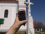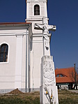 A kereszt talapzatán írás nincs, de van egy motívum, ami nagyon felismerhetetlen. Talán felhő?