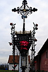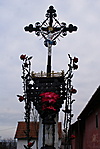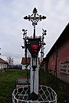 A kicsi de annál szebb kereszt az udvarban áll. Gondozott szépen rendben tartott és virággal ellátott.