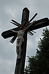 Az út mentén magaslaton álló fakereszt. festett korpusszal.