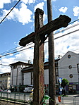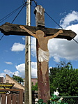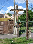 Korhadó fakereszten rozsdás bádog-korpusz. De azért gondozzák, művirág csokrokkal dekorált.