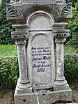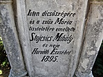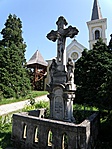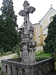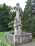 Alacsony, 5 x 5 oszlopos kőkerítéssel kerített, jó állapotban lévő kereszt.
