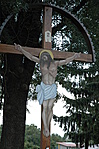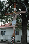 Fa kereszt Krisztus alakkal, kis fekete kerítéssel körbevéve.