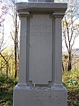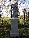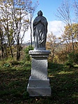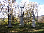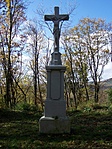 A kereszt mellett Szűz Mária és János apostol szobrai állnak.