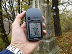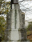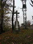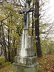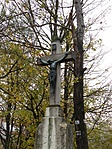 Hangsúlyos posztamensen fakereszt bronz feszülettel.