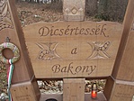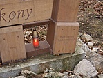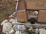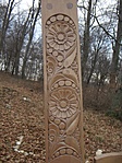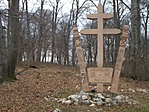 Impozáns fa kettőskereszt, szép, faragott motívumokkal, a Witt-emléktábla fölötti pihenőnél.