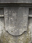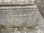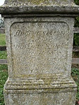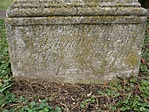 A díszes, de megkopott felirat a kőre rakódott növényzet miatt alig olvasható. Furcsa módon kettő évszám is szerepel a kereszten.