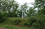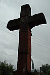 A Dózsa u. Y elágazásában található ez a kopott, törött kereszt. Egy dróthálós fakerítés veszi körül. Nem nagyon gondozzák, bár 2 mécsest találtunk rajta. A festés kopott, a felirat nem látszik. Felújításra szorul.