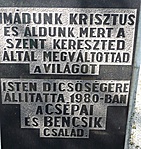 IMÁDUNK KRISZTUS ÉS ÁLDUNK MERT A SZENT KERESZTED ÁLTAL MEGVÁLTOTTAD A VILÁGOT ISTEN DICSŐSÉGÉRE ÁLLÍTTATTA 1980-BAN A CSÉPAI ÉS A BENCSIK CSALÁD