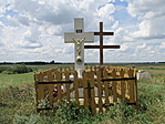 A kereszt betonból van a krisztus i. Jó állapotú, Beton keretben,kovácsoltvas kerítéssel körbevéve, bukszussal, virágokkal, a szántolfölön közel az úthoz!