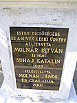 Isten dicsőségére és a hívek lelki üdvére állíttatta Molnár István és neje Suhaj Katalin 1922 felújíttatta Molnár János és családja 2001
