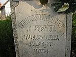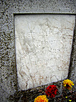 Alig lehet elolvasni a feliratot a márvány táblán. A talapzat oldalába betűk, talán monogramok vannak vésve.