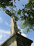 A nagy fáktól alig látni. Beton díszes lalpzat, kerek oszlopon kisebb kereszt, legalább 5 méter magasan. A krisztus teste öntvényből van, kis méretű.Festése kopott mohás.