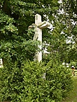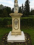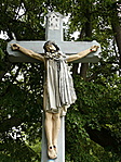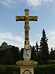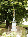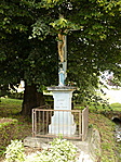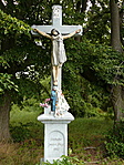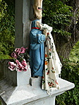 A feszület tövében Mária-szobor, két oldalán egy-egy szent szobra. A bal oldalon Szent Flórián, Jobb oldali szentet nem tudom megállapítani: kos, bot, tarisznya, a lábánál talán egy korona van.