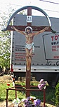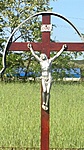 A ceglédberceli katolikus templom előtt található ez a kereszt.