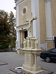 A műemlék templom előtt áll. Nagyon érdekes a talapzatba épített Szent Sír.