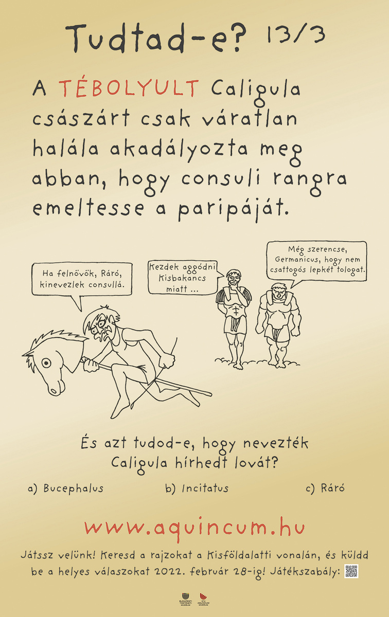 A kérdések ezúttal izgalmas történelmi adatokon alapulnak, s a képregényszerű illusztrációval kísért összesen tizenhárom kérdésből legalább tízre kell helyesen válaszolni. A plakátokat ismét a Kisföldalatti állomásain, valamint az intézmény honlapján és közösségi oldalain találhatjuk meg, az utolsót február 26-ig hozzák majd nyilvánosságra. A megfejtéseket (vagyis a kérdést és a helyes választ) 28-ig kell beküldeni a aquincum@aquincum.hu címre. Eredményt március 1-jén hirdetnek, a beküldők között értékes aquincumi ajándékcsomagokat sorsolnak ki.