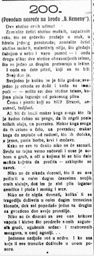 „A horvát lapok is csak viszonylag kis terjedelemben emlékeztek meg a Báró Kemény gőzösön 1918. november 22-23-án tomboló tűzről, amely a feljegyzések szerint kétszáz magyar katona, valamint a hajó francia nemzetiségű kapitánya, a főgépész, a mérnök és egy kadét életét követelték. Még szörnyűbb a tragédia, ha arra gondolunk, hogy a hazafelé tartó magyar katonák már azt gondolták, hogy megmenekültek a háború veszélyeitől, s mégis szörnyű kínhalált kellett halniuk” - mondta el portálunknak Fontányi Árpád, a Horvátországi Magyarok Demokratikus Közössége Spliti Magyar Egyesületének alapító elnöke. „Akkor sem volt nagyobb visszhangja a katasztrófának és sajnos ez az érdektelenség a későbbiekben sem változott, így ma már sajnos nem lehet tudni, hol nyugszanak ezek az azonosítatlan áldozatok.”