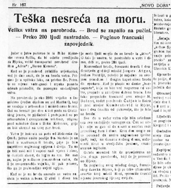 A beszámolók szerint a tűzben kétszáz magyar katona vesztette életét, azonosításuk azonban lehetetlen volt, mert annyira összeégtek a holttestek. Így csak Louis Jacques Atger kapitány és a másik három tengerész holttestét ravatalozták fel a Szent Antal templomban, majd temették el a Sustjepan temetőben. Itt kerültek tömegsírba a magyar katonák földi maradványai is. Miközben a temetés folyt, erős szél támadt és elszakadtak a kötelek, amelyekkel az akkor üresen álló Báró Kemény gőzöst a parthoz rögzítették. A tragédia kísérteties utójátékaként a hajó legénység nélkül elkezdett kisodródni a kikötőből, egy vontató tudta végül megállítani.