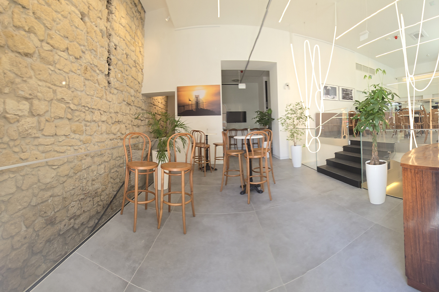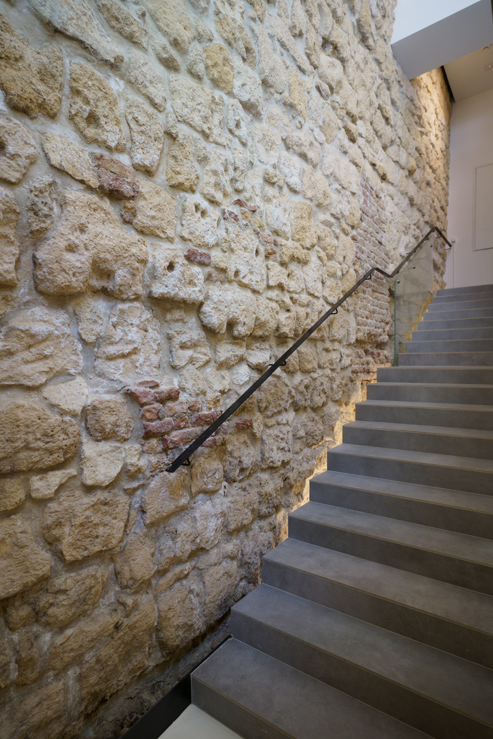 A kiállítóterek a fölöttük néhány hete megnyitott bárból nyílnak, s egy lépcsőn juthatunk le az utcaszint alá. A lépcső mellett ez egykori középkori városfal egy méretes szakaszát közelről is szemügyre vehetjük. A fal a 15. század utolsó harmadában, Mátyás uralkodása alatt készült el valószínűleg, miután már évtizedekkel korábban döntés született a megépítéséről (sőt ekkor egy kis méretű „pesti vár” építésébe is belefogtak, de hamar feladták és visszabontották). A végül felépült városfal egész a 18. századig állt, ekkor kezdték meg a lebontását, bár egyes kisebb szakaszai a mai napig fennmaradtak a városszövetben, többnyire házak belső udvarain, a nagyközönség számára nehezen megközelíthetően.