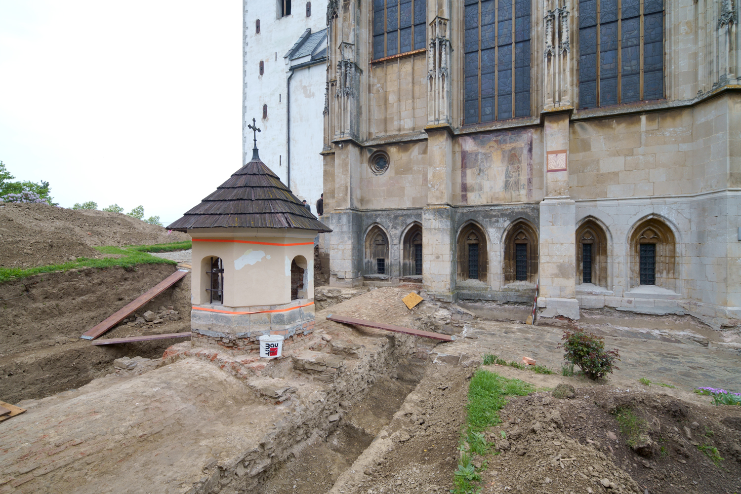 „Közvetlenül a kápolna fala mellett kutattunk, ahol a vízelvezetésre kerül majd sor, illetve elbontottuk a kápolna keleti oldalánál a templomba vezető lépcsőt is. A kápolnán belül az alsó szinten nyílt lehetőségünk kisebb felületen ásatást végezni” - mondta el a Műemlékem.hu Magazinnak Balogh Árpád régész-technikus. „Utóbbi helyen nem sikerült temetkezést azonosítanunk, a betöltésben azonban voltak szórvány emberi csontok, nyilván mert a temető földjét használták fel. Megkutattuk az összekötő folyosó környezetét is a vízelvezető munkák előkészítéseként. Itt több bolygatott temetkezés mellett sikerült kilenc sírt feltárnunk. Az emberi maradványokat az Eperjesi Egyetem Biológia Tanszékének antropológusai Doc. Eva Petrejčíková vezetésével emelték ki, hogy további vizsgálják azokat. Természetesen jó lenne egy átfogó régészeti kutatás is legalább végig a templom falai mellett, azonban ezeket a lehetőségeket a visszatelepült és az épületet ismét gondozó minorita rend anyagi lehetőségei szabják meg.”