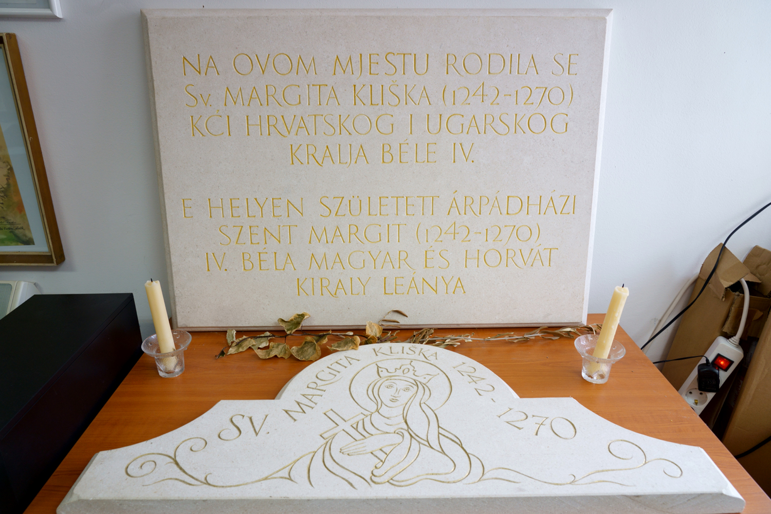 „Az emléktábla még 2000-ben készült el Kerekes Attila László vállalkozó húszezer kunás adományából, Ivo Staničić spliti magyar tiszteletbeli konzul közbenjárásával. Az első években a konzuli irodában várt a sorsa beteljesülésére, vagyis, hogy felhelyezzék Szent Margit valószínű szülőhelye, Klissza várának falára, s tíz éve hozták át az egyesület irodájába” - mondta el portálunknak Fontányi Árpád, a Horvátországi Magyarok Demokratikus Közössége Spliti Magyar Egyesületének alapító elnöke. „Sajnos az elmúlt évtizedben sem tudtuk elérni, hogy tábla betölthesse rendeltetésszerű szerepét, tulajdonképpen már nem is nagyon reménykedünk benne.”