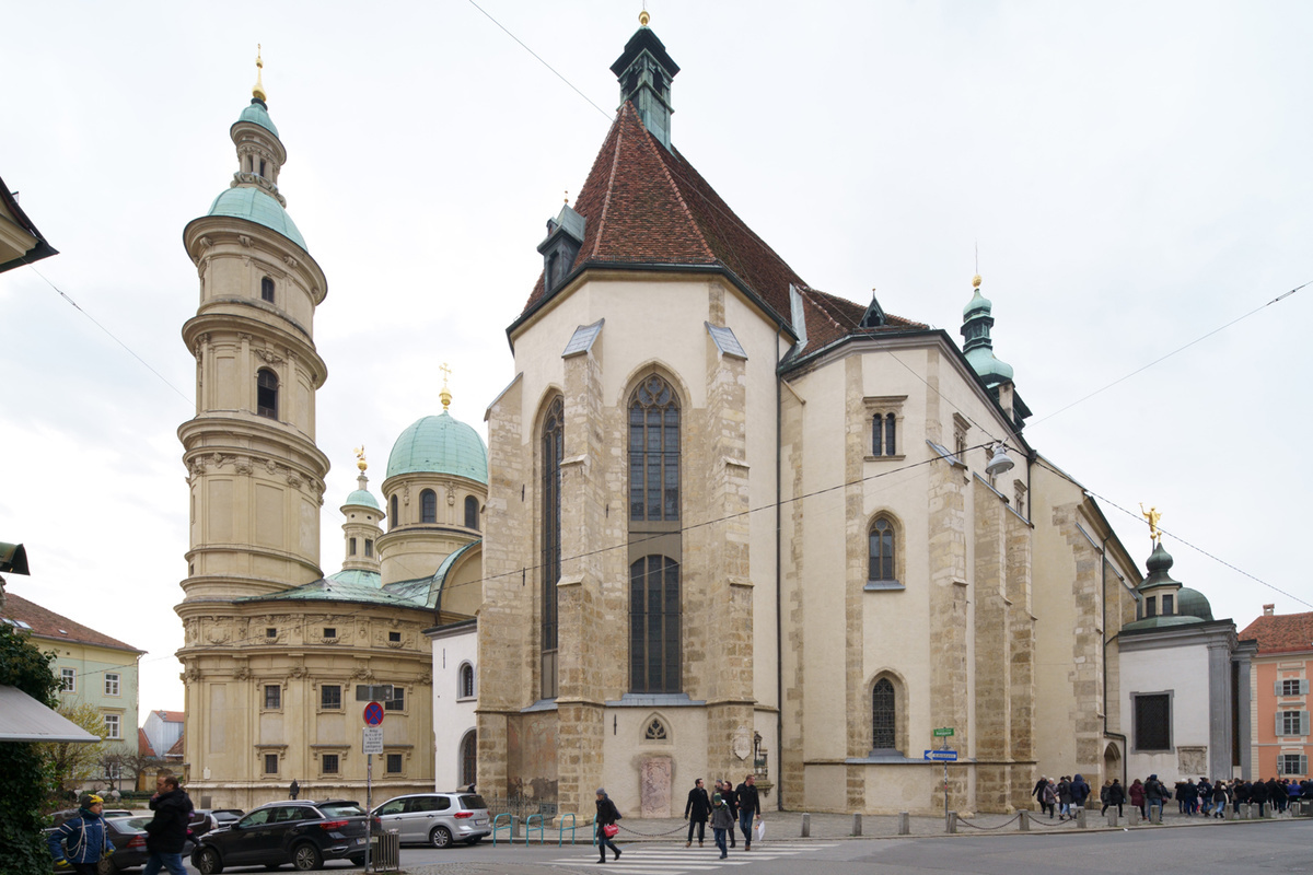 Végül a harmadik a csigalépcsőtől alig egy kőhajításra található Szent Egyed-székesegyház lett. A háromhajós, keletelt, gótikus templomot a 15. század közepén építették a grazi burg plébániatemplomának, 1462-ben szentelték fel. 1786 óta az akkor alapított Graz-Seckau egyházmegye püspöki temploma, vagyis székesegyháza.