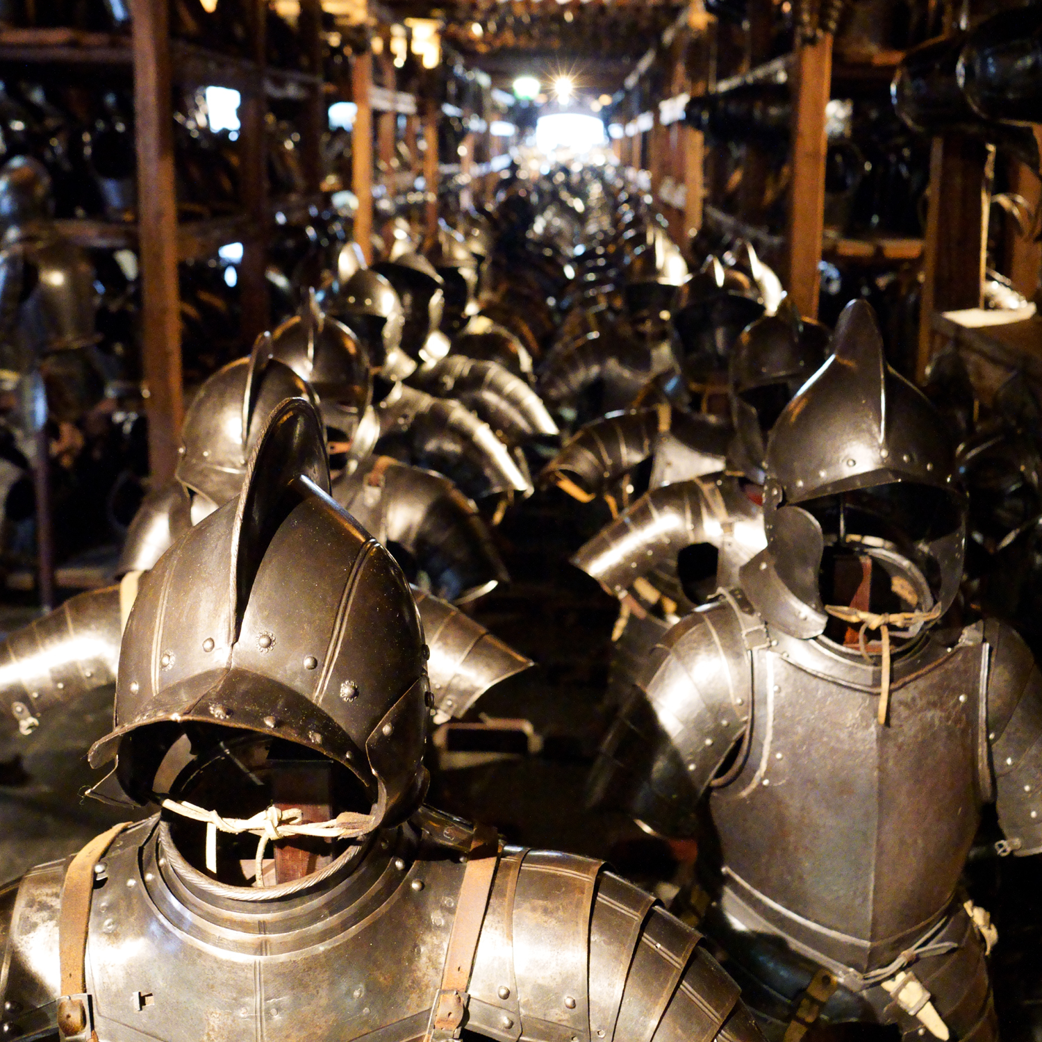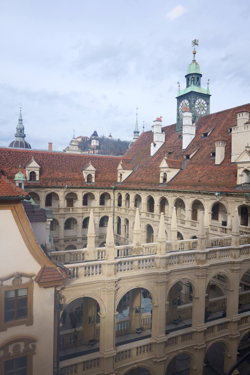 A történelemlecke után kezdjük meg a virtuális utazásunkat a városban, amelynek első – sőt talán legfontosabb – állomása a Landhaus összetett építéstörténetű tömbje a történelmi belváros Mura felőli oldalán. A tartományi székház déli szárnya az 1642 és 1644 között épült Landeszeughaus, egy teljességében és érintetlenségében fennmaradt városi fegyvertár, amely a 16. századtól tartalmaz hatalmas mennyiségben tárgyakat. A látható gyűjtemény 32 ezer darabból áll, négy szinten lehet megnézni a vágó és szúrófegyverek, páncélok, sisakok, tűzfegyverek roppant sokaságát. A székház reneszánsz loggiás udvara szintén megdöbbentő, különösen, hogy ennek az építészeti stílusnak a korával (is) milyen mostohán bánt a magyart történelem. Érdemes elgondolkodni rajta, hogy vajon ennek az érintetlenségnek inkább az az oka, hogy idáig már nem ért el az oszmán birodalom, vagy a stájerek jobban megbecsülték, amilyük volt (esetleg mindkettő).