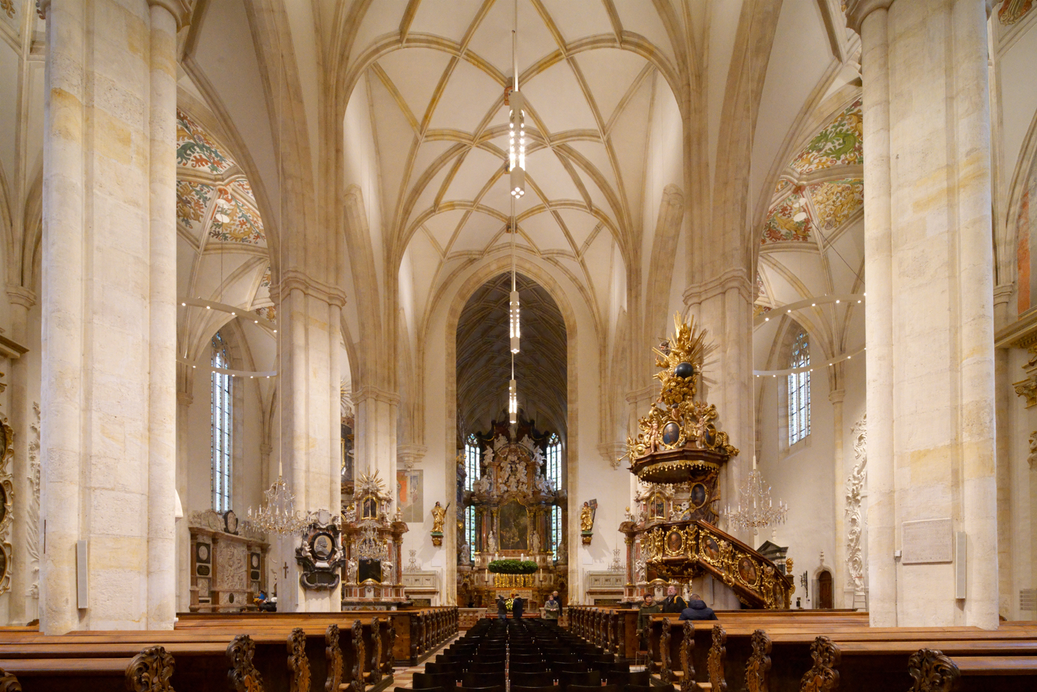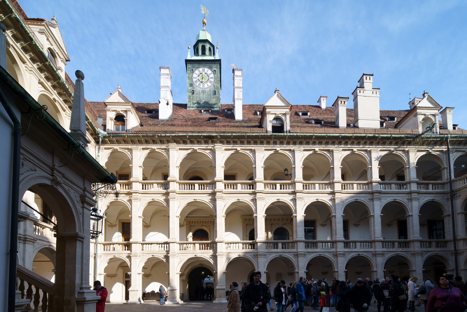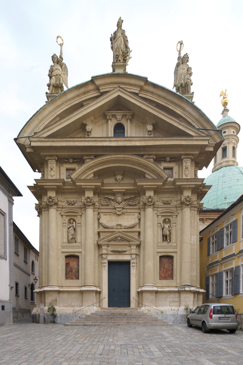 Közvetlen közelükben a többször átépített Burg, ma a stájer tartományi kormányzat székhelye található. Az 1438-tól épült egykori palota egyik nemzetközi hírű látványossága a 15. század legvégén készült kettős csigalépcső.
