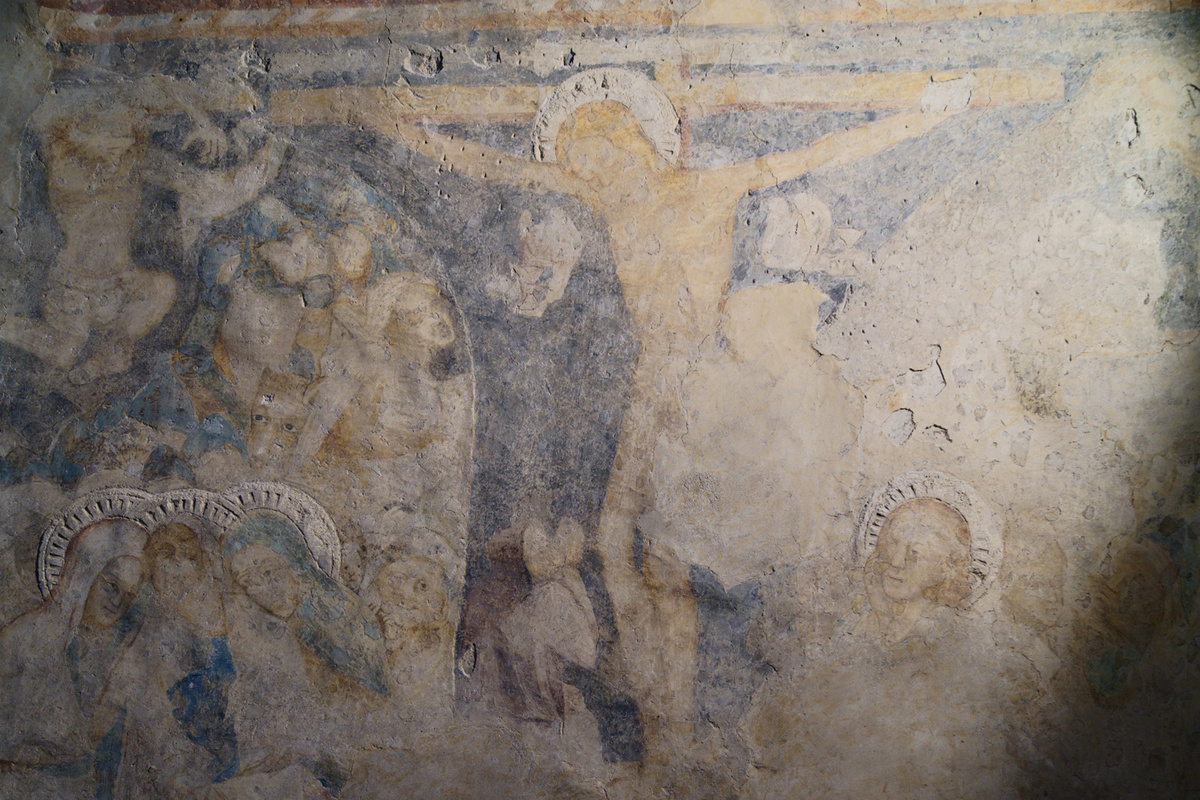 A templom egykori szentélyében látható freskók feltehetően a Bebek-család legismertebb 14. századi tagjához, Bebek Györgyhöz köthetőek. Ő ugyan az általa alapított gombaszögi pálos kolostorba temetkezett 1390-ben (sírkövét innen vitték át a tornagörgői plébániatemplomba), ám ez nem zárja ki, hogy a királynéi tárnokmesterként, diplomáciai követként is tevékenykedő főúr valóban Itáliából (ahol maga is megfordult I. Lajos király hadjárata során) hozatott mestereket a pelsőci templomba. A több ütemben feltárt, töredékes freskók az angyali üdvözlettől egész a keresztrefeszítésig mutatják be Jézus életének jeleneteit, többségüket pedig a meszelés mentette meg a pusztulástól.