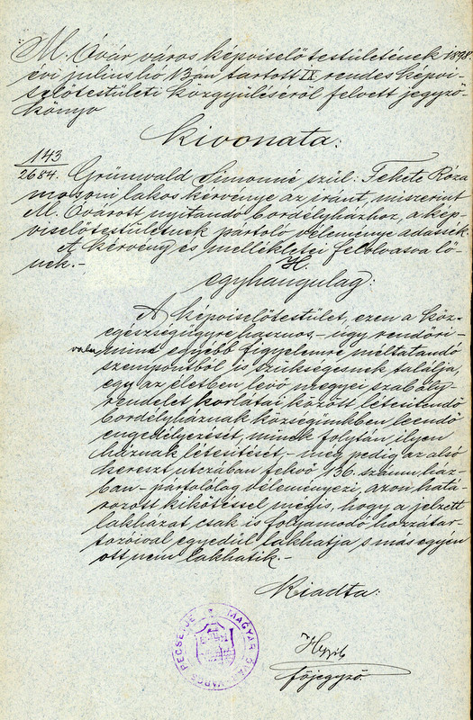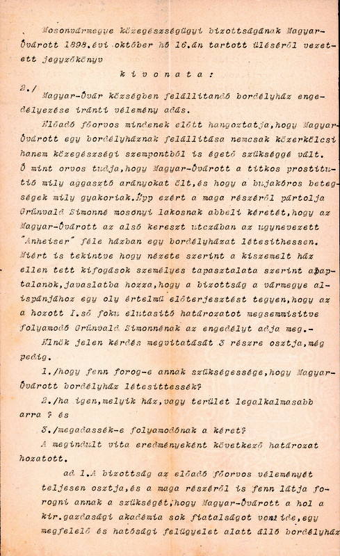 Először az illetékes főszolgabíró az érvényben lévő Moson vármegyei 1888/122. sz. „Bordélyházakra és kéjnőkre vonatkozó” szabályrendelet alapján elutasította Grünwaldné kérelmét, amiért nem rendelkezett feddhetetlen előélettel. A „Madam” természetesen fellebbezett a megyei alispánhoz, ahol megváltoztatták az elsőfokú eljárás döntését. Az engedélyeztetésben jelentős szerepet vállalt a megyei főorvos, aki már régóta szorgalmazta egy ilyen intézmény létesítését, mondván „...egy település erkölcsössége azon nem mérhető le, hogy nincs bordélya, mert pont ezzel ad teret az erkölcsösség romlásának, mert a fiatalság és a férfiak természetbeli szükséglete”. Köztudomásúnak nevezte Magyaróvár és Moson rossz hírét a titkos kéjelgés terén „... itt hol az ország legelőkelőbb családjainak sarjai nem csak a felsőbb kiképzést de a bujakórt is kapják.” Éppen ellenkezőleg, úgy vélte, hogy ettől lesz rendezett keretek közé terelve az eddigi illegális prostitúció. Nemcsak közerkölcsi, hanem közegészségügyi szempontból is égető szükségletnek tartotta. A helyszínt is jónak vélte, mert rendészetileg és orvosilag is jó, ha a városban van, nem pedig félreeső helyen, ahol tér nyílik a bűnözésre.