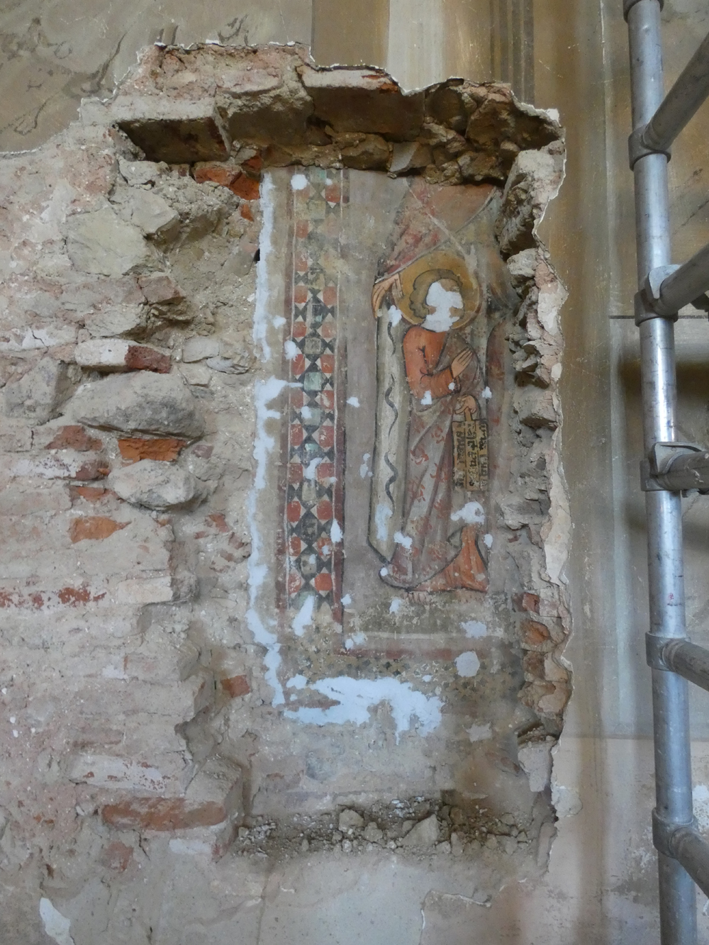 Még csak egy árva felszentelési kereszt sem jutott nekünk! – gondoltuk. Na, mindegy, így legalább szabadabban végezhetjük a belső „roncsolásos falkutatást”. Utóbbi művelet neve eleve némi visszatetszést kelt olyan helyeken, ahol sokan úgy képzelik, szikével és kisecsettel kellene dolgoznunk. Pedig hidd el, kedves Olvasó, a roncsolásos falkutatás egy nagyon finom és rengeteg „észmunkát” igénylő, a motoros bontókalapácsot a kifejezett intellektussal ötvöző munkafolyamat! Kiinduláskor van egy előzetes munkahipotézised arról, mi is van ott, előtted a falban. De mihelyst kalapácsod alatt lehullik az első tenyérnyi vakolat, rögtön elkezdesz spekulálni, mit is látsz és ennek ismeretében hogyan változhat az előbbi hipotézised? Boldogult, legendás régészprofesszorunk, László Gyula ezt az időszakot nevezte el igen találóan „termékeny bizonytalanságnak”! Én például folyton szövegelni szoktam az állványon, miközben bontogatom a vakolatrétegeket. Csak úgy, magamnak, hangosan gondolkodva, mit is látok és mi következik ebből… Ezen a jelenlévők, segítők vagy bámészkodók, gondolom, jól szórakoznak… Privát ötletbörze ez, ilyenkor még ki szabad mondani olyan bolond asszociációkat is, amit egy perc múlva már magad is cáfolnál. A hallgatóságnak pedig mindig elmesélem, hogy egy kutatásnál nem menet közben kell mindent tudnunk, minden kérdésre választ adnunk, hanem – jobb esetben – a végén, amikor minden begyűjthető adat és információ a kezünkben van.