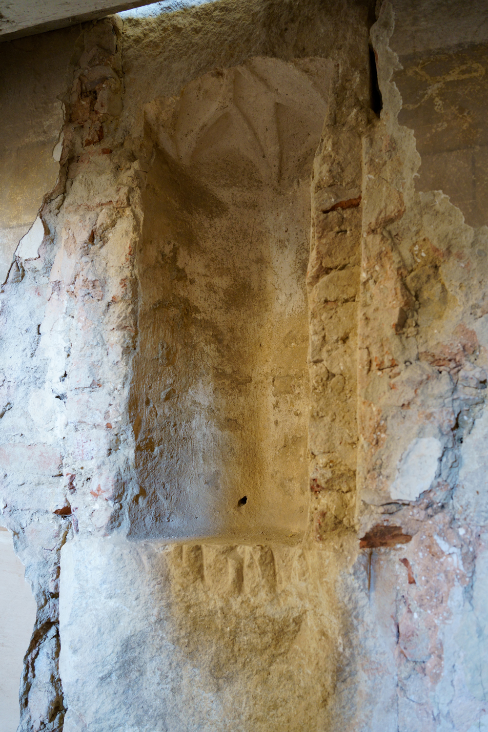 Mérán is így ment ez. Ha már freskó nincs, hát gyűjtsük be ami van! Szép lassan idebent is megtaláltuk a templom középkori nyílászáró rendszerének idáig vakolattal elfedett, de 2018-ban kívülről megtalált elemeit: az elfalazott déli kaput, az egykori sekrestyeajtót, a hajó 13-14. századi, korai ablakait. Ezekre valójában mindre számítani lehetett. Biztosak lehettünk az egykori szentély északi-északkeleti részén egy szentségtartó fülke, latinul pastoforium létezésében is, ami a templom építésekor itt gyakorolt, katolikus liturgia elengedhetetlen eleme volt és amelyet a templom református felekezetű tulajdonosai később befalaztak. Megvidámította szívünket, hogy a Mérán is szerencsésen megtalált, nagyméretű, vakítóan fehér mészkőből faragott pastoforium igen nívós alkotásnak bizonyult! Bár sajnos levésve és ripityára törve találtunk rá, de az ősök megtették azt a szívességet, hogy a fülkét a „bontás” saját sittjével tömedékelték el. Így, bár maga az alkotás elpusztult, de az így szerencsésen megmenekült töredékek lehetőséget adnak az egykor konzolosan előreugró, gótikus boltozatot utánzó belső terű, talán üvegezett (!) nyílásokkal és kis szoborfülkével is rendelkező, pompás későgótikus épületelem elméleti rekonstrukciójára!