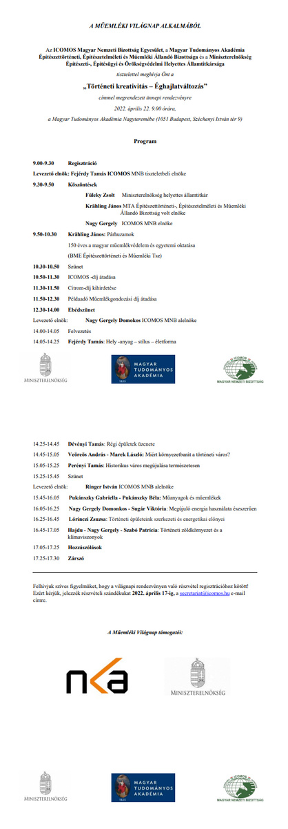 Másnap, 22-én a Műemléki Világnap alkalmából az ICOMOS Magyar Nemzeti Bizottság Egyesület, a Magyar Tudományos Akadémia Építészettörténeti, Építészetelméleti és Műemléki Állandó Bizottsága és a Miniszterelnökség Építészeti-, Építésügyi és Örökségvédelmi Helyettes Államtitkársága ünnepi rendezvényt tart „Történeti kreativitás – Éghajlatváltozás” címmel a Magyar Tudományos Akadémia Nagyteremében. Itt kerül majd sor a szokásos ICOMOS-díjak átadására is. A részletes programot a cikk végén találják meg az érdeklődők. A rendezvény látogatása regisztrációhoz kötött, s a secretariat@icomos.hu email címen lehet jelentkezni.