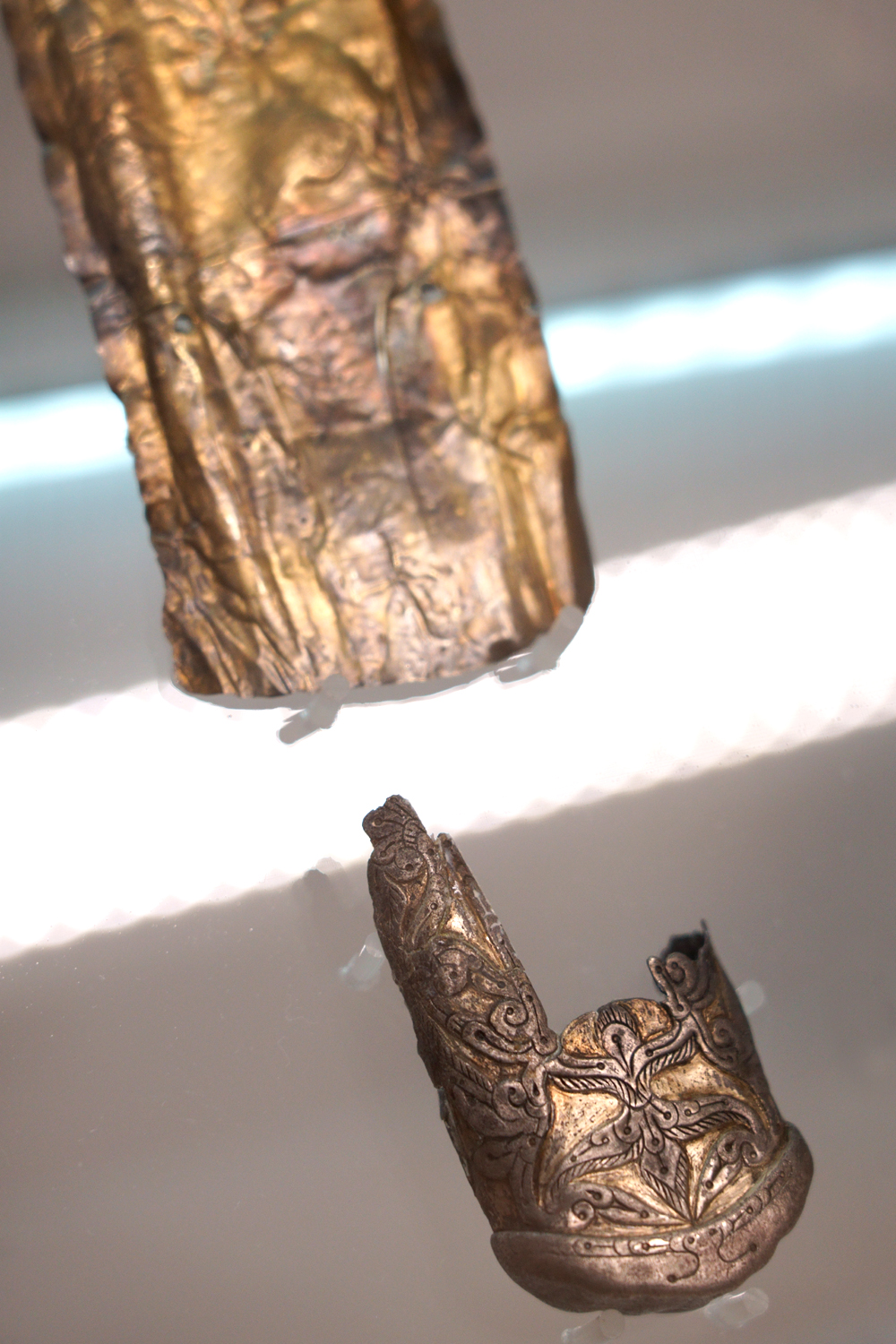 A Szabolcs vezér földjén szerencsére több egy „kincstár” bemutatásánál (bár ha csak az lenne, az is elég volna), hiszen a helyszűke dacára tematikusan ismertet meg a korszak tárgyi kultúrájának legbecsesebb, legérdekesebb darabjaival. Tematikusan vezet végig a folyosón, s a csúcspontja természetesen a rakamazi és a geszterédi leletegyüttes, láthatjuk az itt előkerült egy-egy „aranyszablyát” is – összesen három ilyet ismerünk –, amelyek minden bizonnyal fejedelmi temetkezésekhez tartoztak.