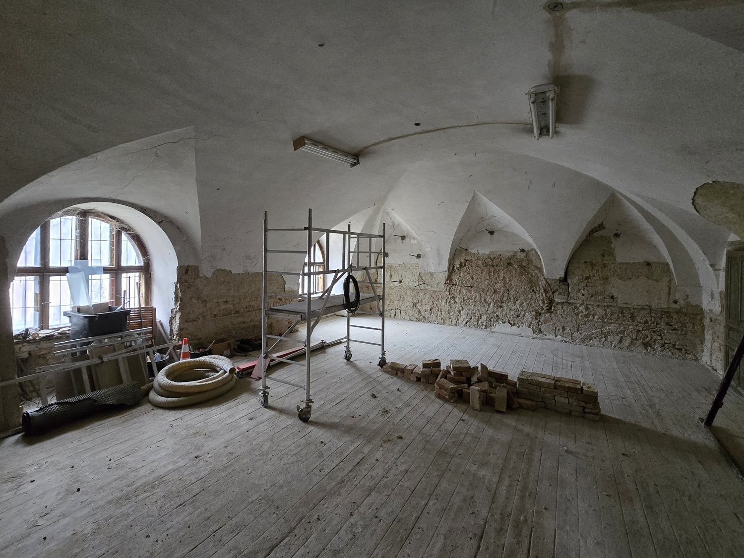 A kutatás másik helyszíne a barokk kori refektórium, amelyet a déli és a keleti szárny „sarkán” alakítottak ki. Ezt az egykor impozáns, nagy belmagasságú teret sajnos a későbbiekben két szintre és négy részre választották (megfelezve a magasságát is), s az eredeti funkcióhoz képest meglehetősen méltatlan használat dacára díszítőelemek nyomaira, vakolatdíszekre és kifestésekre bukkantak. A talán legépebb ezek közül egy 18. század végi katona-ábrázolás – ami a kutatóktól a Napóleon nevet kapta –, amelyet éppen az egyik, részben ráfalazott válaszfal őrzött meg. A barokk refektórium már közvetlen falkapcsolatban van a 13. századi építészeti elemekkel, itt egykor a kolostor konyhája kapott helyet.
