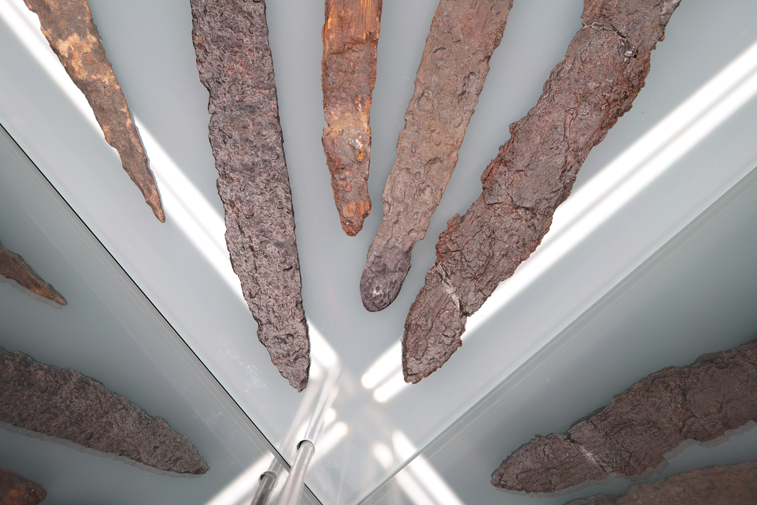 A viking kapcsolatoknak ugyanakkor kézzel fogható tárgyi emléke az úgynevezett Szent István-kard (amely ebben a tárlatban sajnos nem látható, hiszen már a 14. századtól a prágai Szent Vitus-székesegyházban őrzik, s jelenleg egy vándorkiállítás részeként úton van Európában). Ezt a kardot Szent István királyhoz köti mind a hagyomány, mind a kutatás, s bár a pengéjét egy Rajna menti műhelyben kovácsolhatták, a markolat és az összeszerelés már viking munka. A feltevések szerint ez volt az a kard, amellyel felövezték a még csak nagyfejedelem Istvánt, mielőtt a Koppány elleni hadjáratára indult volna.