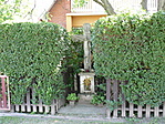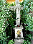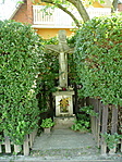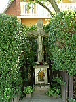 Kissé eldugott helyen van a kereszt, egy kerti beugró részen, bokrokkal körülvéve. Elfogadható állapotban van.