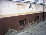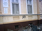 Az épületen vakolathiányos részek vannak. Itt is, mint szinte minden házon a belvárosban falfirkák csúnyítják az épületet.